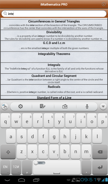 Entre los muchos temas incluidos en iMathematics! se encuentran los siguientes: aritmética, trigonometría, geometría, álgebra y probabilidad. Cualquiera de ellos es hallable fácilmente con el buscador, permitiéndote redactar anotaciones y almacenar los contenidos, incluyendo los trucos de matemáticas.